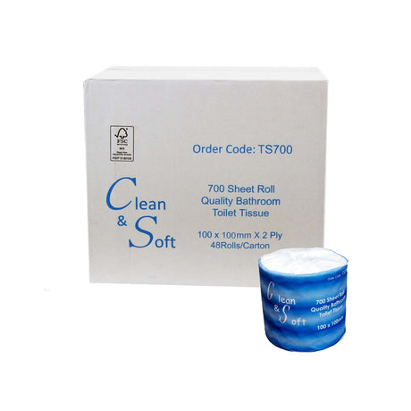 TS700 - TOILET PAPER ROLL 700M SHEETS 10CM X 10CM 2 PLY VIRGIN 48 ROLLS